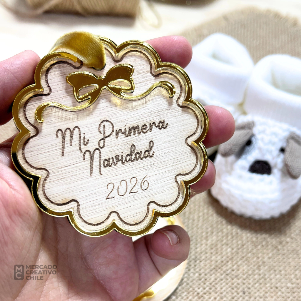 Fabricado con corte láser en terciado y acrílico dorado espejado, este colgante es elegante y delicado, ideal para decorar el árbol, la puerta o cualquier espacio especial en el hogar. Personalízalo con el nombre del bebé, la frase “Mi primera Navidad”, “Bebé en camino” y el año para hacerlo único y lleno de significado.